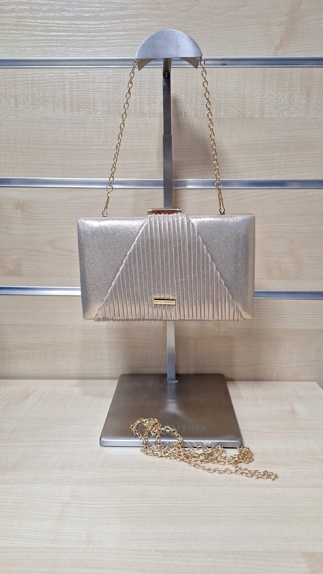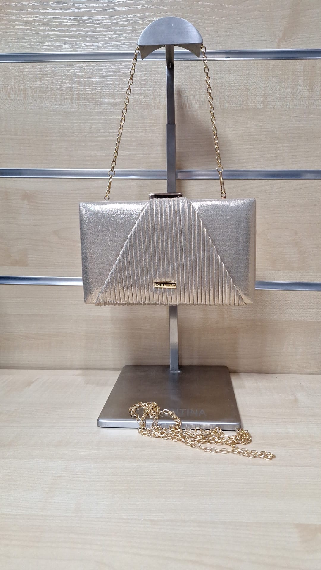1. Puzderko z ozdobnego materiału. Model z długim łańcuszkiem w zestawie.