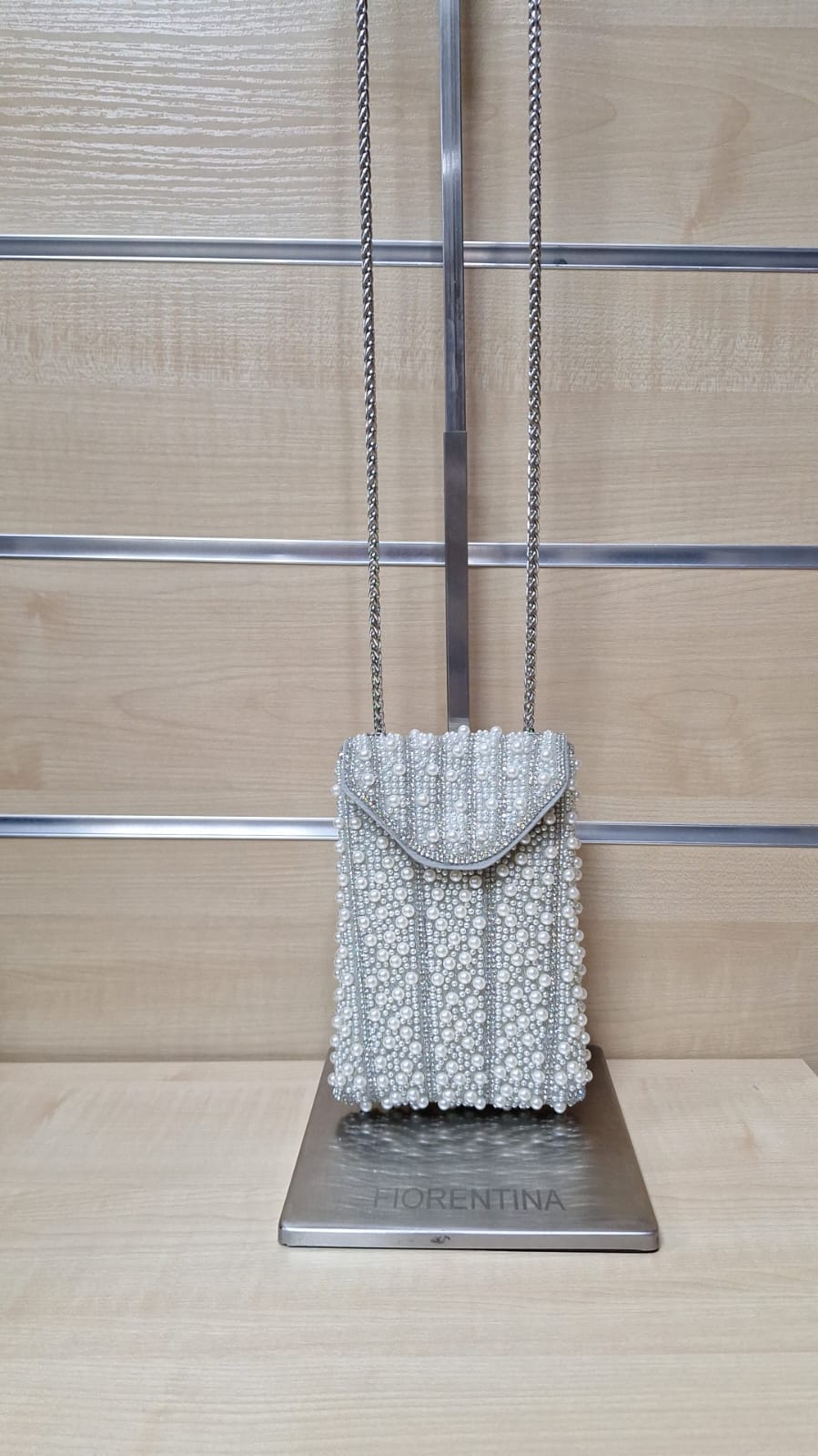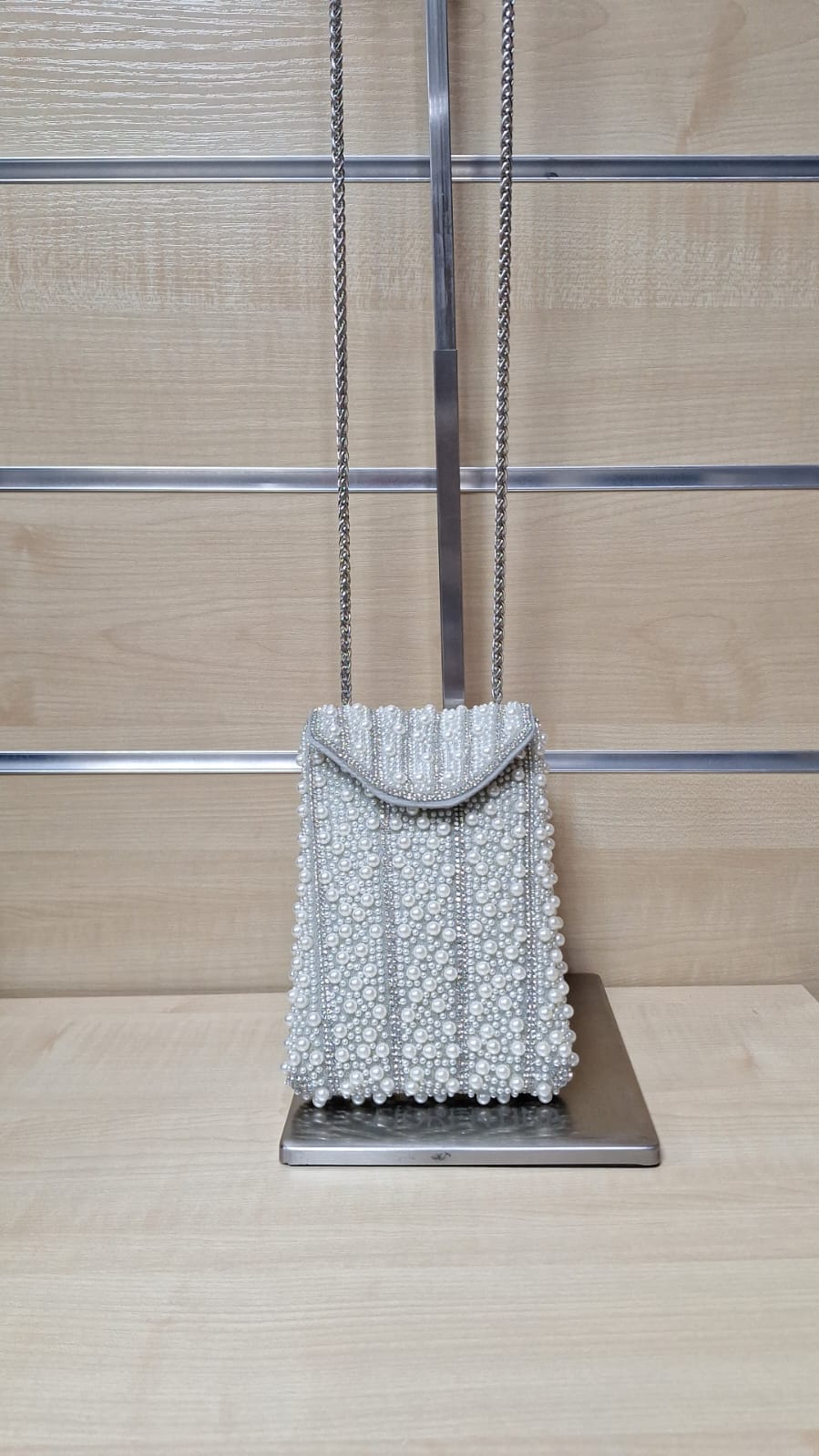 1. Puzderko z ozdobnego materiału. Model z długim łańcuszkiem w zestawie.