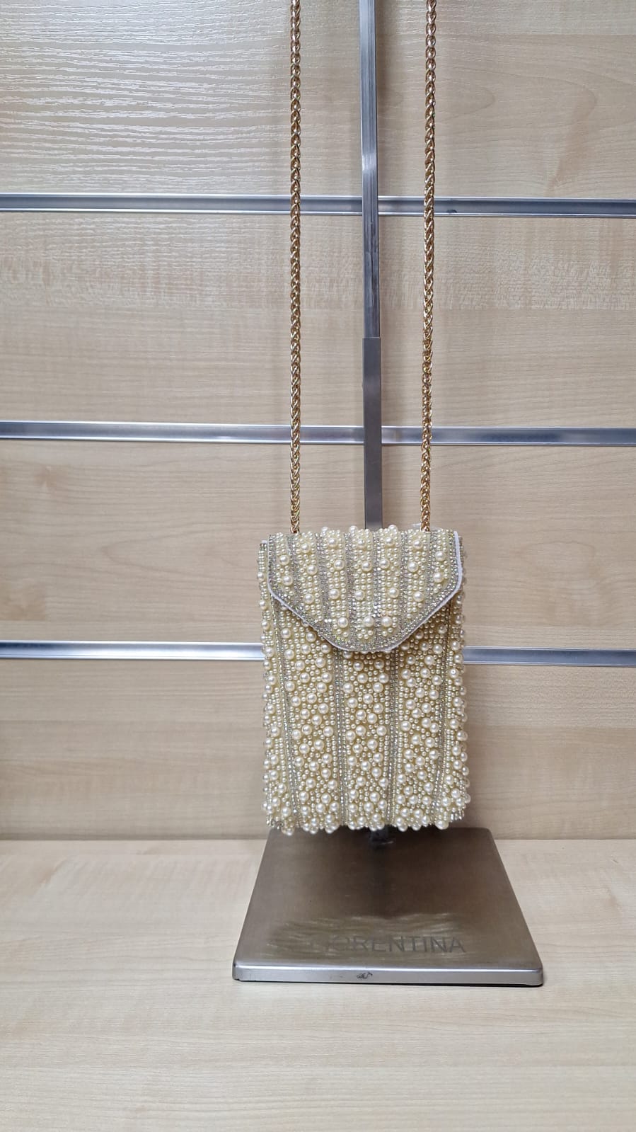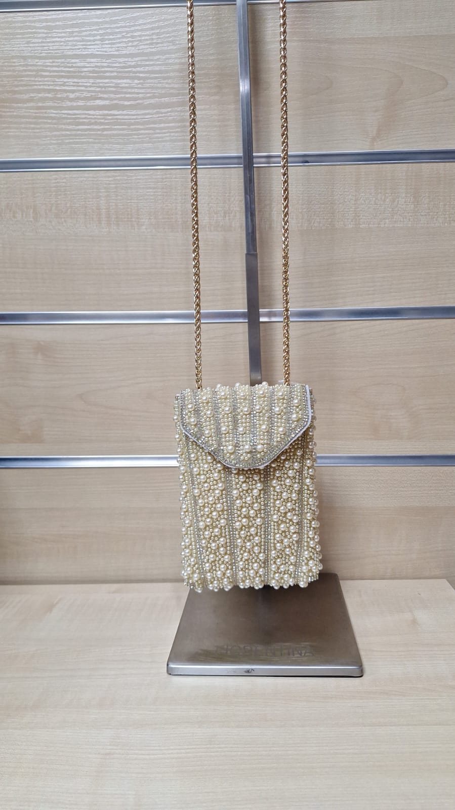 1. Puzderko z ozdobnego materiału. Model z długim łańcuszkiem w zestawie.