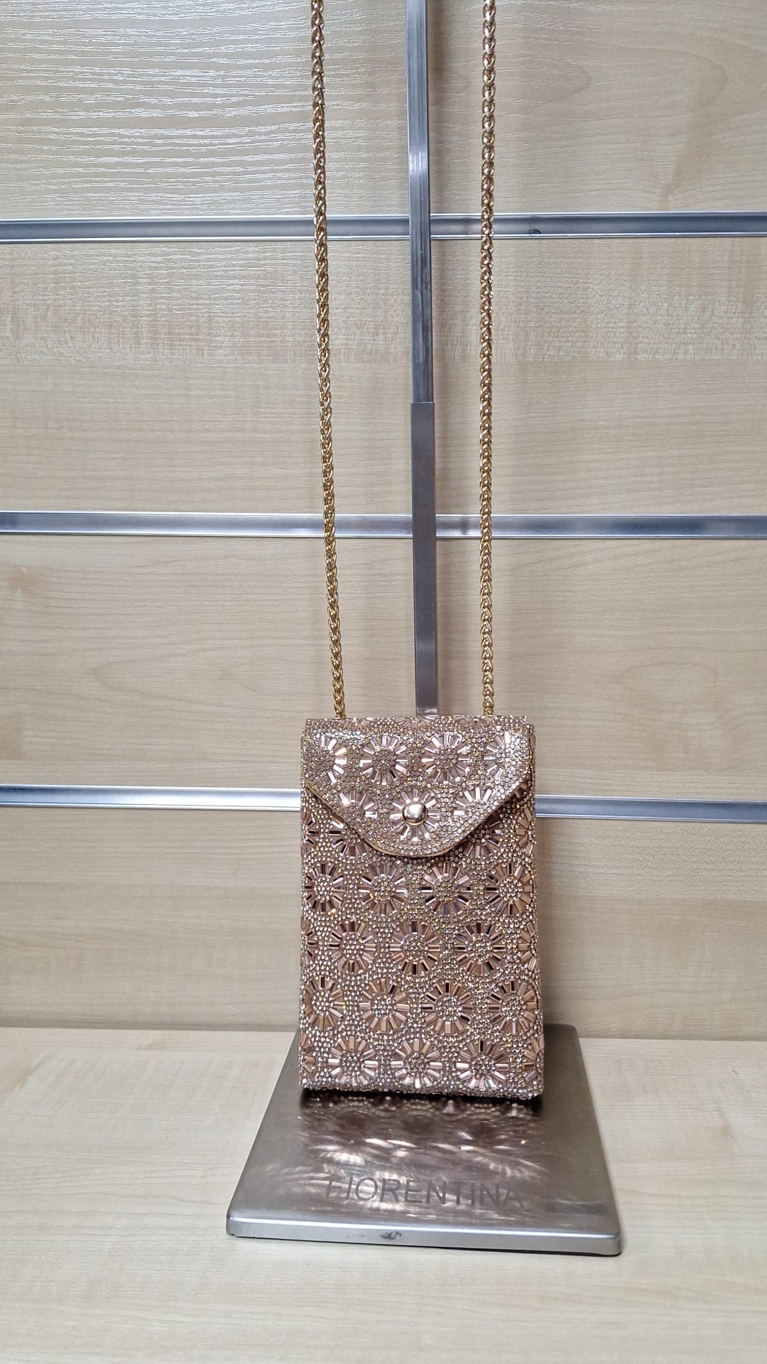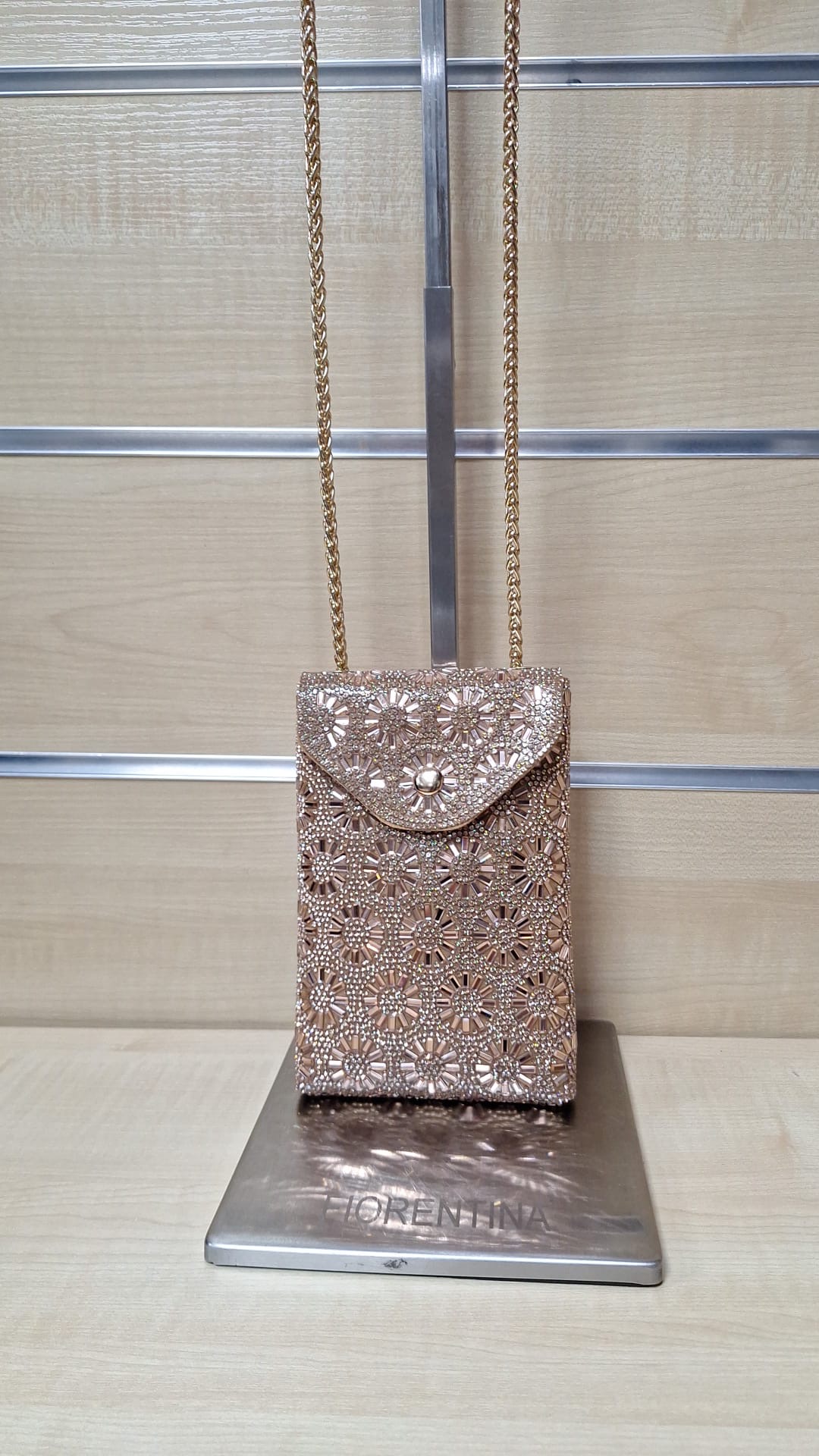 1. Puzderko z ozdobnego materiału. Model z długim łańcuszkiem w zestawie.