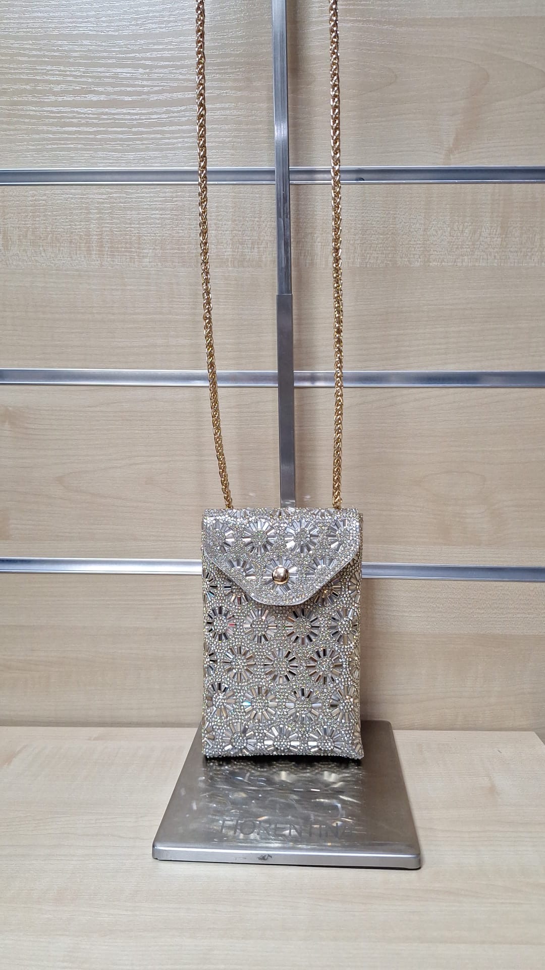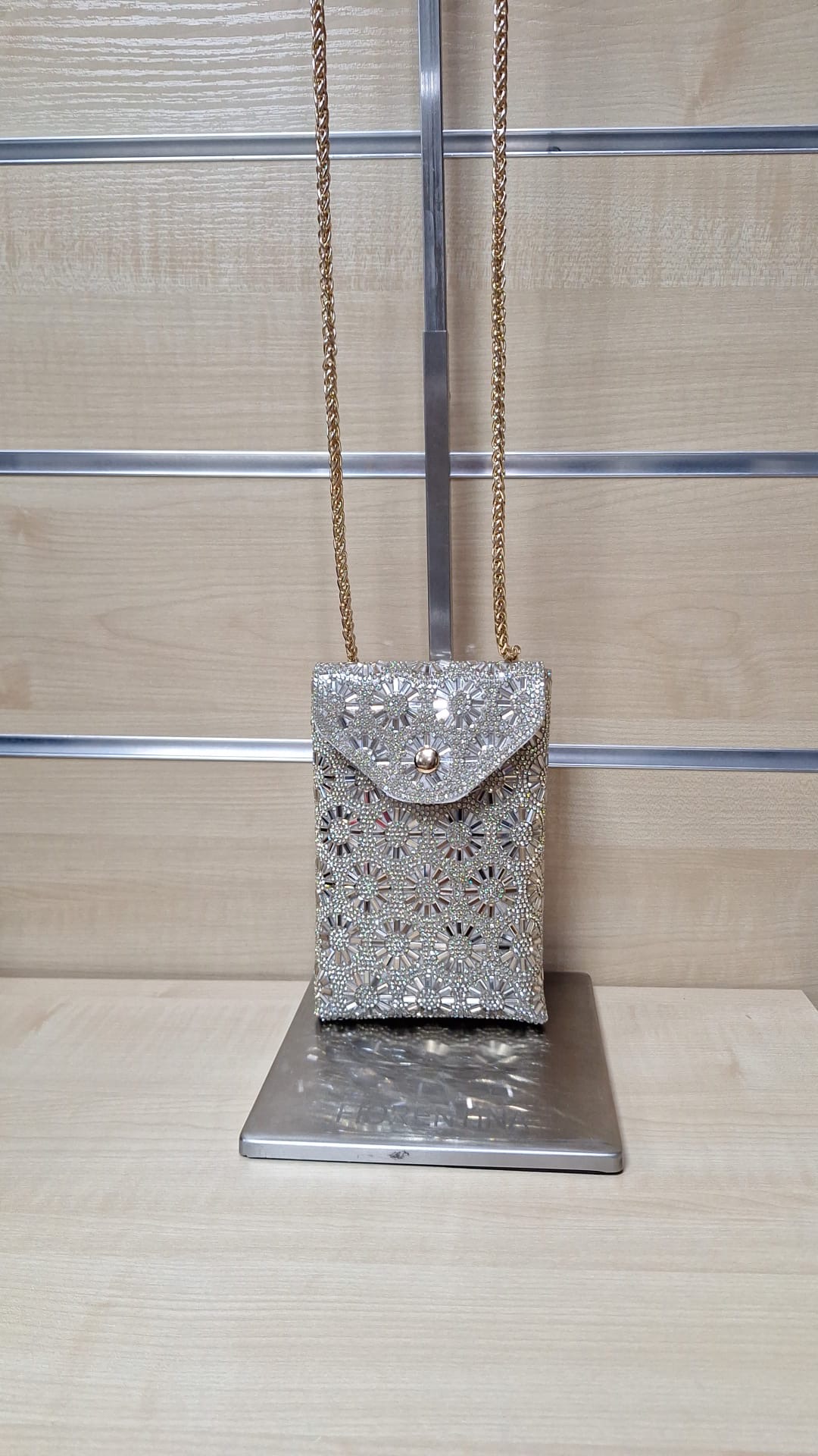 1. Puzderko z ozdobnego materiału. Model z długim łańcuszkiem w zestawie.