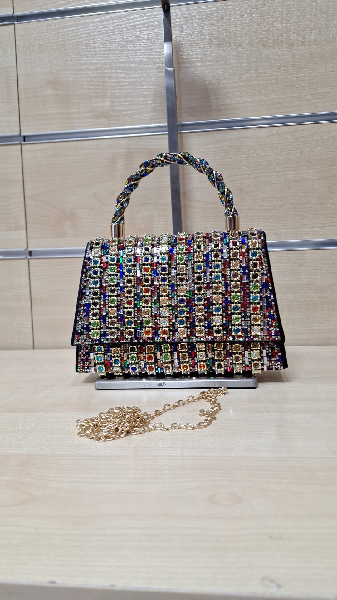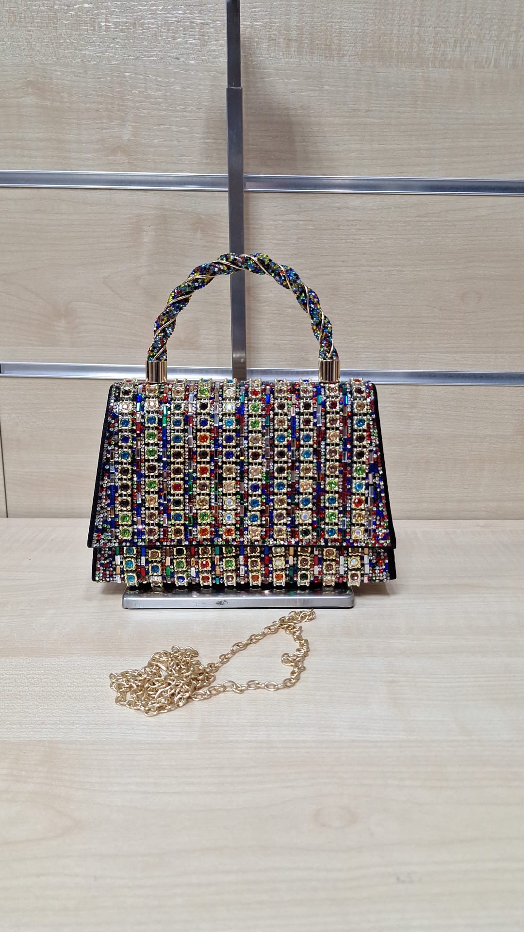 1. Puzderko z ozdobnego materiału. Model z długim łańcuszkiem w zestawie.