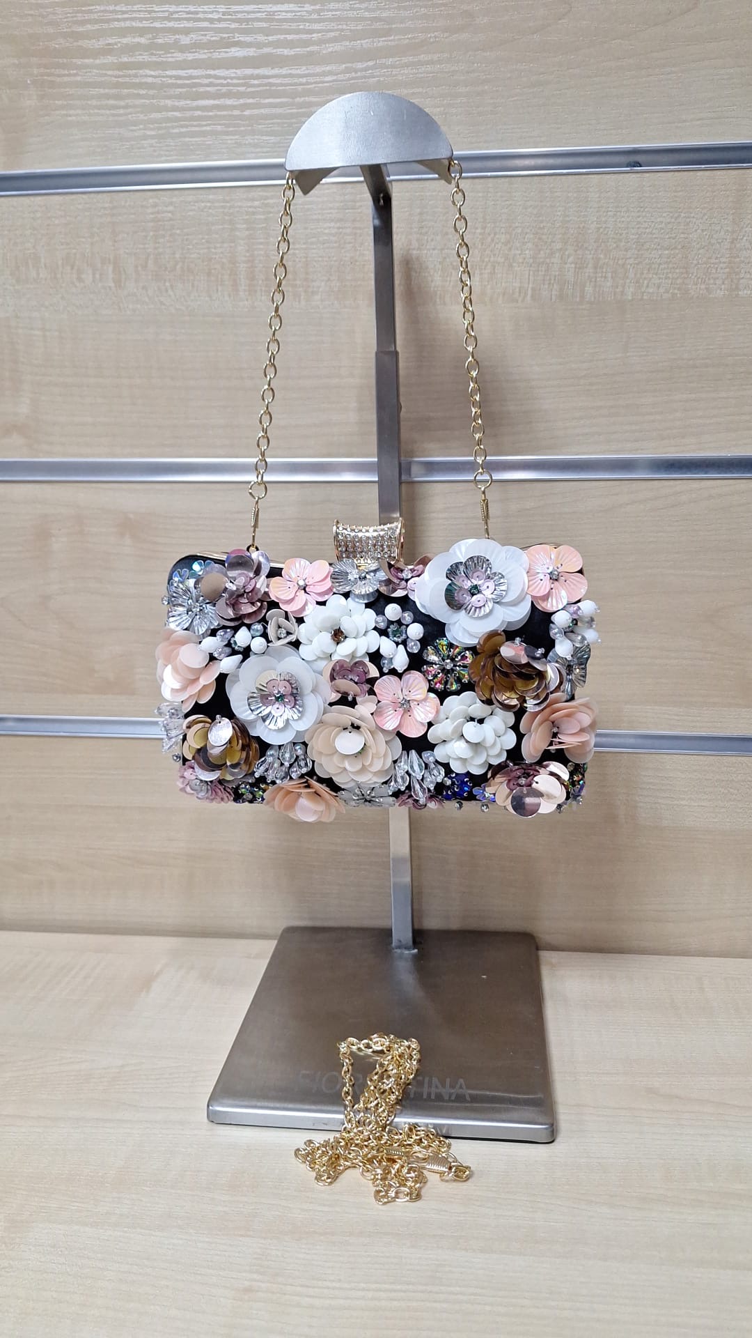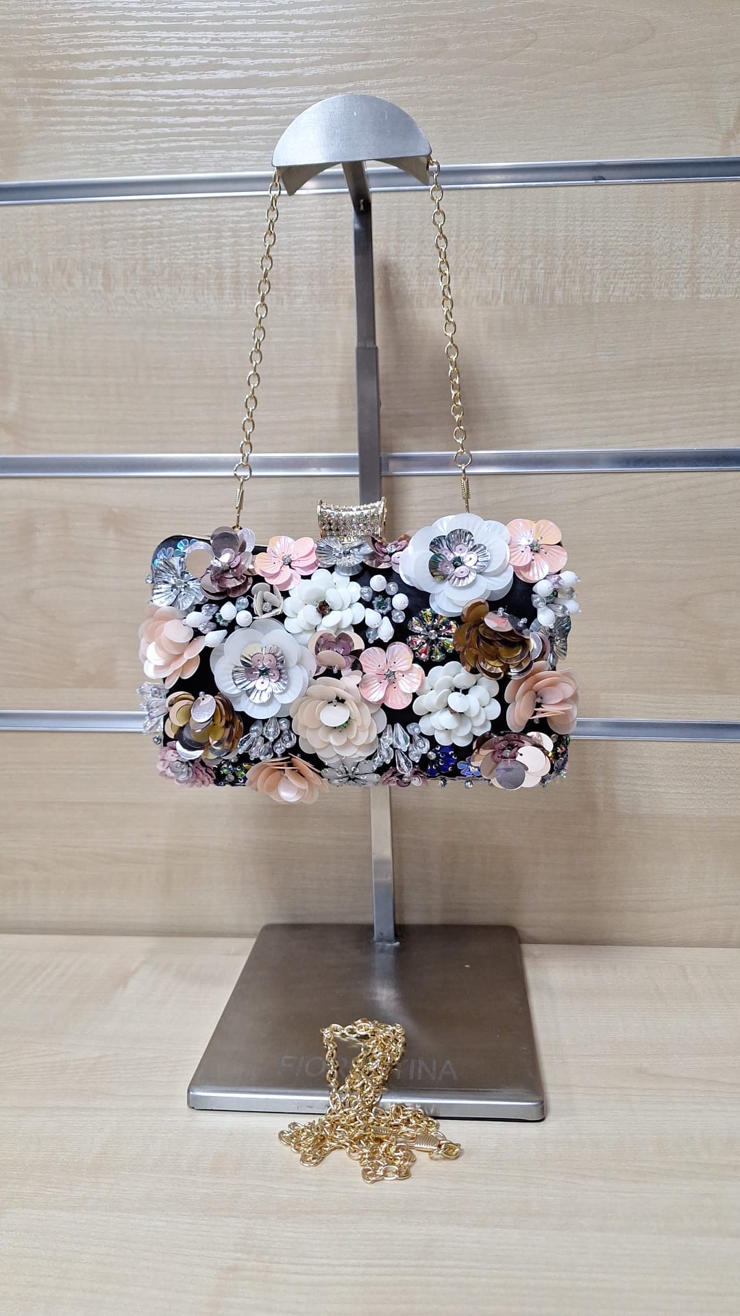 Puzderko z ozdobnym przodem. Model z długim łańcuszkiem w zestawie.