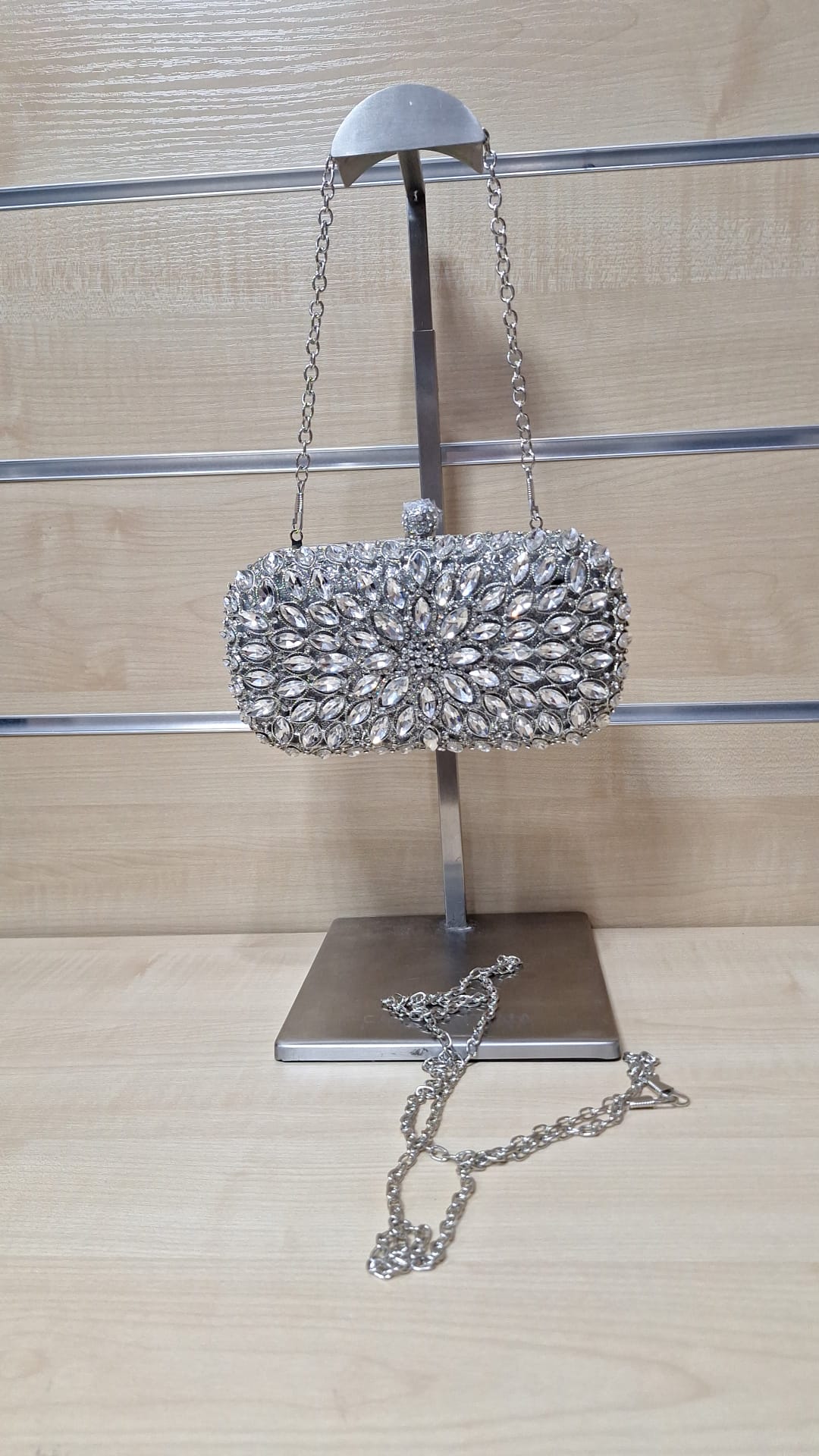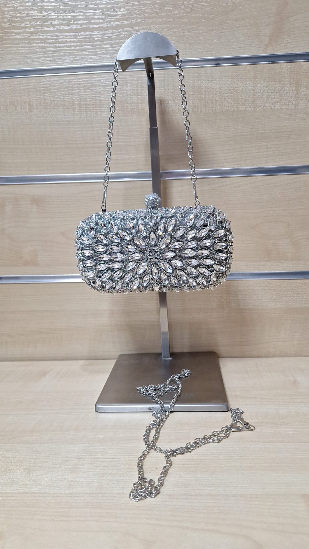 1. Puzderko z ozdobnego materiału. Model z długim łańcuszkiem w zestawie.